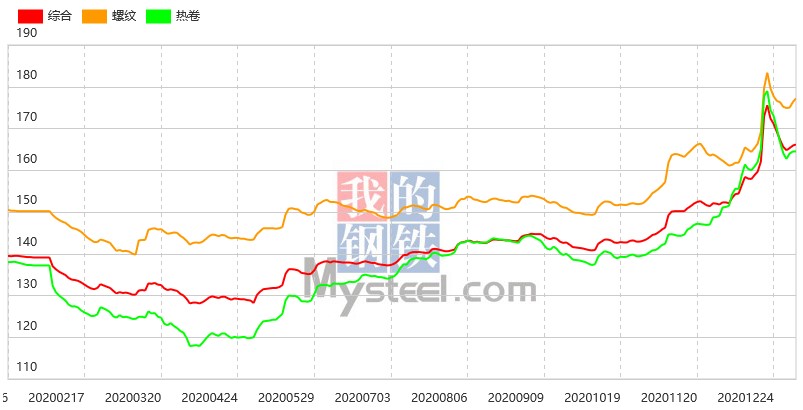 1月5日,國內(nèi)鋼材指數(shù)綜合指數(shù)報166.15(絕對價格指數(shù)4728),較上一交易日上漲0.17%。其中,螺紋鋼指數(shù)報177.18(絕對價格指數(shù)4478),較上一交易日上漲0.48%。熱卷指數(shù)報164.47(絕對價格指數(shù)4611),較上一交易日持平。